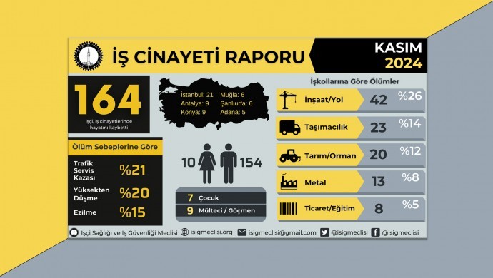 İşçi Sağlığı ve İş Güvenliği Meclisi, Kasım ayında yaşanan iş cinayetlerine dair raporu yayımladı. Rapora göre, Kasım’da en az 164, yılın ilk 10 ayında en az bin 708 işçi yaşamını yitirdi. Kasım ayında, 10’u kadın, 7’si çocuk ve 9’u mülteci olmak üzere 164 işçi, iş cinayetlerinde hayatını kaybetti. 42 işçi tarım-orman, 20 işçi taşımacılık, 23’er ölüm ise ticaret ve konaklama alanlarında yaşandı.