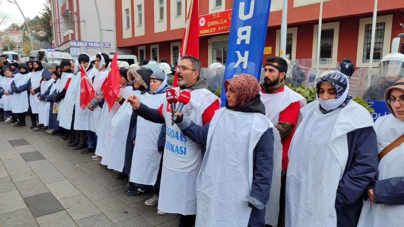 İki gündür Çatalca Adliyesi önünden hareket etmek isteyen işçilere polis bugün de saldırdı. Adliye çevresini barikatlarla kapatan çevik kuvvet, işçilere saldırdı.