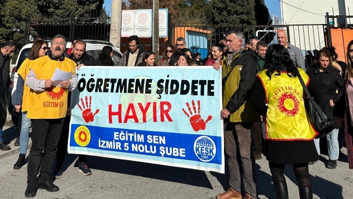 Eğitim ve Bilim Emekçileri Sendikası İzmir 5 Nolu Şubesi, Buca ilçesinde İsmail Şekip Uyal İlkokulu’nda görevli üyeleri Derya Demir’e yönelik fiziki saldırıyı protesto etti. Okul önünde yapılan açıklamada, “Öğretmene şiddete hayır” pankartı açıldı.