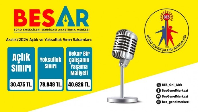 Büro Emekçileri Sendikası Araştırma Merkezi, Aralık ayı açlık ve yoksulluk verilerini açıkladı. BES-AR verilerine göre Aralık ayında açlık sınırı 30 bin 475 TL, yoksulluk sınırı ise 79 bin 948 TL’ye yükseldi. Verilere göre ayrıca tek bir çalışanın yaşam maliyeti ise 40 bin 626 TL olarak hesaplandı.