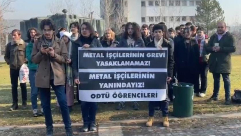 Ortadoğu Teknik Üniversitesi’nde öğrenciler, yasaklama kararına rağmen grevlerini sürdüren metal işçileriyle dayanışmak için eylem yaptı. Fizik çimlerinde toplanan öğrenciler “Metal işçilerinin grevi yasaklanamaz! Metal işçilerinin yanındayız” pankartı açtı.