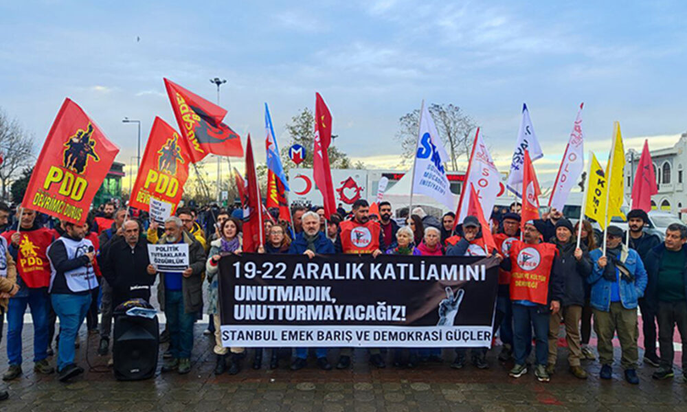 İstanbul Emek, Barış ve Demokrasi Güçleri, 19-22 Aralık Hapishaneler Katliamı’nın yıl dönümü dolayısıyla Kadıköy Rıhtım’da bir basın açıklaması gerçekleştirdi. Açıklamada “Bizler, adalet ve özgürlük isteyenler olarak, devrimci tutsakların aileleri, yakınları, dostları ve yoldaşları olarak, 19 – 22 Aralık Katliamı’nın hesabını sormaya, faşizme karşı direnişimizi büyütmeye devam edeceğiz” denildi.