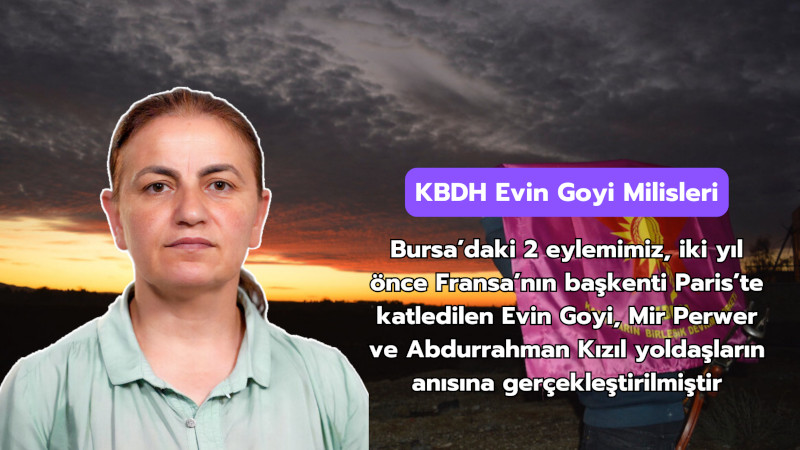 Kadınların Birleşik Devrim Hareketi (KBDH) Evin Goyi Milisleri tarafından yapılan yazılı açıklama ile Bursa’da iki eylem yapıldığı duyuruldu. KBDH Evin Goyi Milisleri yaptıkları açıklamada 22 Aralık gece, 23:00 civarında, Bursa’nın Nilüfer ilçesi, Alaaddinbey Semtinde AKP-MHP işbirlikçisi bir işverene ait tesis ve çiftlik sabotaj yöntemi ile yakıldığını ve eylemde işletme ve tesis büyük oranda zarar gördüğü ayrıca 23 Aralık’ta gece saatlerinde, Bursa’nın Yıldırım ilçesi, Samanlı mahallesinde yer alan DİP Marketin deposu ateşe verilip deponun tamamen kül olduğu belirtildi. KBDH Milislerinin eylem sonrası güvenli bir şekilde alanlarına çekildiği de vurgulandı.