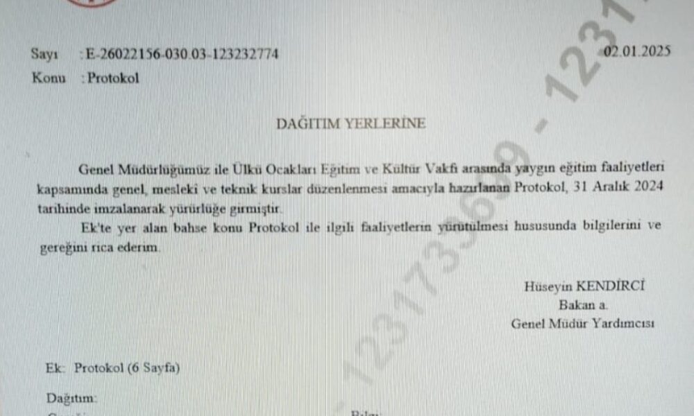Milli Eğitim Bakanlığı Hayat Boyu Öğrenme Genel Müdürlüğü’nün, 2 Ocak tarihinde gönderdiği yazıda Ülkü Ocakları’yla protokol imzaladığının bilgisi verildi. Kurumlara Genel Müdür Yardımcısı Hüseyin Kendirci’nin imzasıyla gönderilen yazıya göre 31 Aralık 2024’te yürürlüğe giren protokol kapsamında Ülkü Ocakları okullarda yaygın eğitim faaliyetleri kapsamında genel, mesleki ve teknik kurslar açacak.