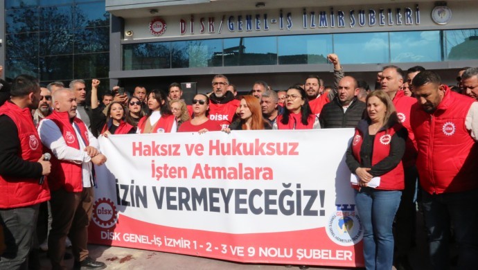 Genel Hizmetler İşçileri Sendikası İzmir şubeleri, İzmir Büyükşehir Belediyesi’nde çıkarılan üyeleri için DİSK Ege Bölge Temsilciliği binasında basın toplantısı düzenledi. “Haksız hukuksuz işten atılmalara izin vermeyeceğiz” pankartı yer aldığı toplantıda, “Birleşe birleşe kazanacağız”, “Baskılar bizi yıldıramaz”, “İş ekmek yoksa barış da yok” ve “Zafer direnen işçilerin olacak” sloganları atıldı.