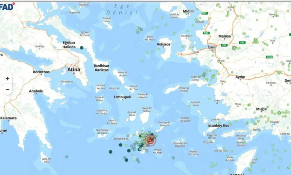 “Ege Denizi’nde, 28 Ocak 2025 tarihinden itibaren yoğunlaşmaya başlayan depremlerin sayısı an itibarıyla 400’ün üzerine çıkmıştır. Deprem fırtınası şeklinde gelişen bu aktivite sonucunda şu ana kadar kaydedilen en büyük deprem 4.8 Mw büyüklüğündedir. Depremler, Santorini Adası’nın yaklaşık 25 km kuzeydoğusunda artış göstermekte olup derinlikleri 5 – 25 km arasında değişmektedir. Ülkemiz kıyılarına en yakın deprem 140 km mesafede gerçekleşmiştir.