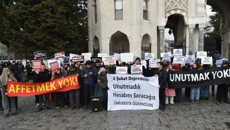Üniversite öğrencileri, 6 Şubat deprem katliamının yıldönümünde İstanbul Üniversitesi Beyazıt ana kapısı önünde basın açıklaması yaptı. “”6 Şubat depremini unutmadık, hesap soracağız”, “Affetmek yok”, “Unutmak yok” pankartları açılan eylemde sık sık “Afet değil rant öldürür”, “Affetmek yok, unutmak yok”, “Katillerden hesabı gençlik soracak”, “Deprem değil bu bir katliam” ve “AKP yıktı biz kuracağız” sloganları atıldı.