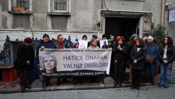 İHD’liler para göndermeden önce şube binaları önünde açıklama yaptı. Çok sayıda hak savunucunun katıldığı açıklamada, “Hak savunucularına yargı baskısına son! Hatice Onaran’a yalnız değildir” pankartı açılırken, Hatice Onaran’ın da fotoğrafı taşındı.