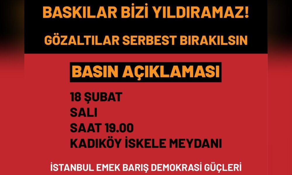 İstanbul Emek, Barış ve Demokrasi Güçleri, artan baskı ve gözaltılar bu akşam saat 19.00’da Kadıköy İskele Meydanı’nda bir araya gelerek, protesto edecek.
