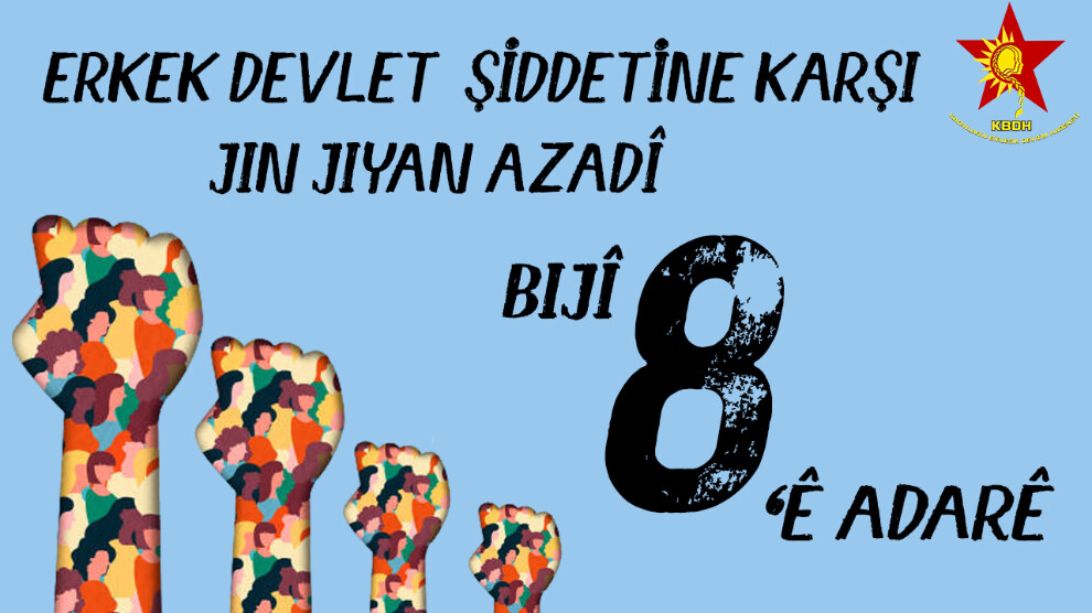 KBDH, “8 Mart’a giderken Türkiye/Kuzey Kürdistan ve bölgede ezilen kadınların, halkların öfkesi her geçen gün daha fazla büyüyor. Çünkü erkek egemen kapitalist, gerici, işgalci, faşist sistemler Türkiye’den, Bakur Kurdistan’a, Suriye’den, Afganistan’a, İran’dan/Rojhilat’a ve Filistin’e kadar erkek devlet şiddetiyle, savaş politikalarıyla kadınlar katlediliyor, açlığın, yoksulluğun cenderesinde geleceği karartılıyor” dedi.