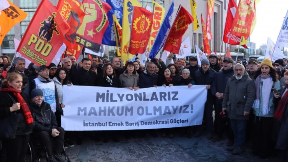 Çağlayan’da bulunan İstanbul Adliyesi önünde yapılan eyleme HDK Eşsözcüleri Meral Danış Beştaş ile Ali Kenanoğlu, Halkların Eşitlik ve Demokrasi Partisi (DEM Parti), Cumhuriyet Halk Partisi (CHP), Türkiye İşçi Partisi (TİP) milletvekili ve yöneticilerinin yanı sıra çok sayıda siyasi parti, kurum, kuruluş, platform temsilcileri katıldı.