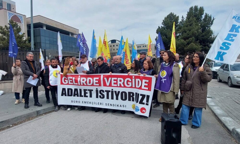 Büro Emekçileri Sendikası (BES), “gelirde ve vergide adalet” talebiyle çok sayıda kentte basın açıklaması yaptı. Ankara’da, Hazine ve Maliye Bakanlığı önünde bir araya gelen sendika üyeleri, vergi adaletsizliğinin konuşulmadığı vergi haftalarını kutlamayı kabul etmediklerini kaydetti. Emekçiler, “Artık bir servet aktarma biçimini alan vergi adaletsizliğine son verin” dedi.