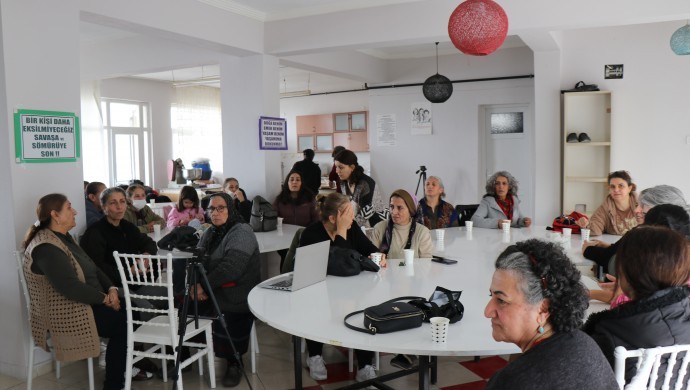 Demokratik Alevi Dernekleri İzmir Şubesi Kadın Meclisi, 8 Mart etkinlikleri kapsamında Çiğli’nin Güzeltepe Mahallesi’nde bulunan Kadın Dayanışma Derneği’nde söyleşi gazeteci Çilem Küçükkeleş düzenledi. Söyleşi yapılan salona “Kadınlar özgürlüğe yürüyor, özgürlük için örgütleniyor, mücadelemizi yükseltiyoruz. Hak ve hakikat ocağın sahibi kadındır” pankartı ile “Jin jiyan azadi”, “Turna avazıyla direnen kadınlara bin selam olsun”, Hak ve hakikat mücadelesinde pervane olan kadınlara aşk olsun” dövizleri asıldı. Söyleşiye katılımıyla çok sayıda kadın katıldı.
