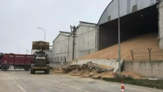 Sakarya’nın Karasu ilçesinde özel bir liman işletmesine ait tahıl deposunun duvarı, aşırı dolum nedeniyle çöktü.