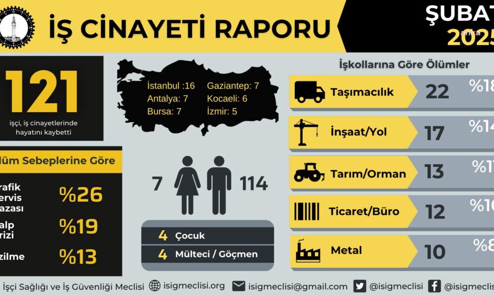 İşçi Sağlığı ve İş Güvenliği Meclisi (İSİG), “Şubat 2025 İş Cinayeti Raporunu” açıkladı. Rapora göre, Şubat ayında 121 işçi, iş cinayeti sonucu katledildi.