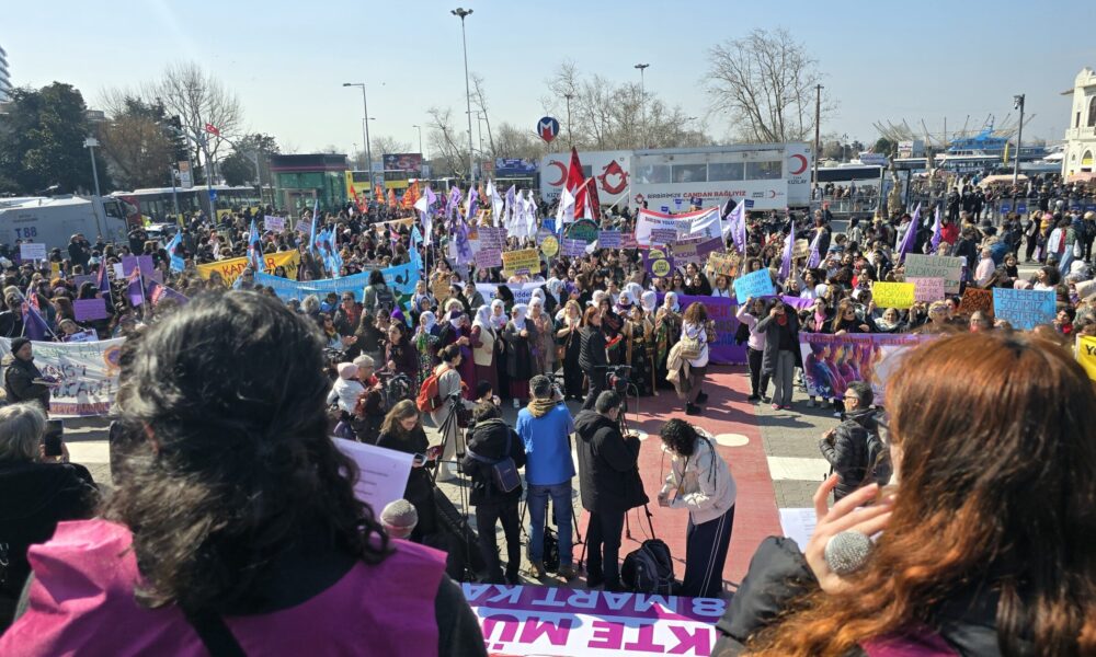8 Mart Kadın Platformu’nun çağrısıyla düzenlenen Büyük Kadın Buluşması 13.00’te başladı. Binlerce kadın Kadıköy İskele Meydanı’na akın etti. Çeşitli kadın örgütleri alana sloganlarla girerken kürsüden isimleriyle pankartları anons edildi. Kadınlar
