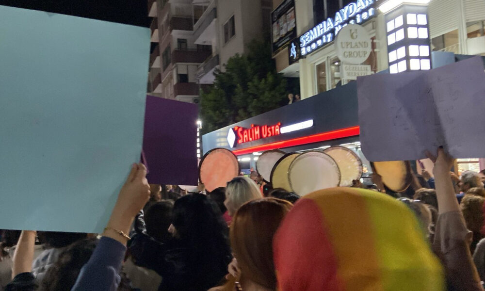 Mersin’de kadınlar, 11’incisi düzenlenen Feminist Gece Yürüyüşü için Kushimato Sokağı’nda bir araya geldi. MUAMMA LGBTİ+ Derneği’nin gökkuşağı bayrağı ile dernek binasından çıkması ise polisler tarafından engellendi.