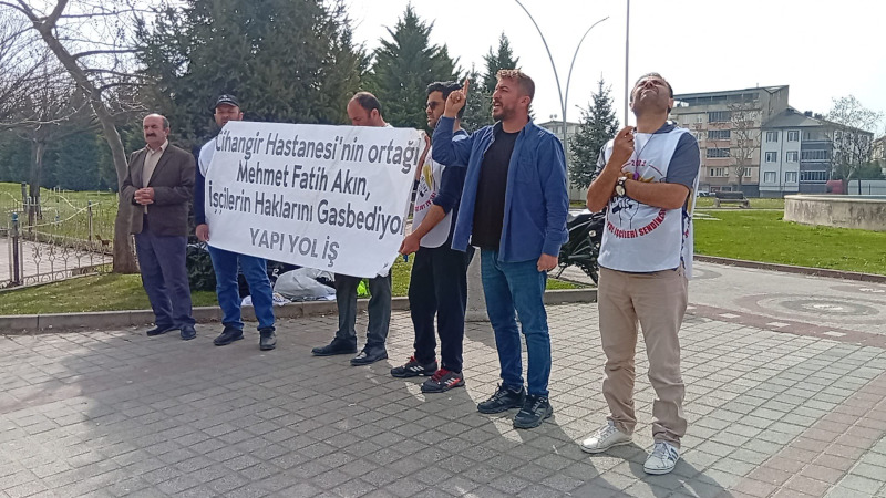 “Cihangir Hastanesinin ortağı Mehmet Fatih Akın, işçilerin haklarını gasp ediyor” pankartının açıldığı eylemde, “İnşaat işçisi köle değildir”, “Direne direne kazanacağız” sloganları atıldı.