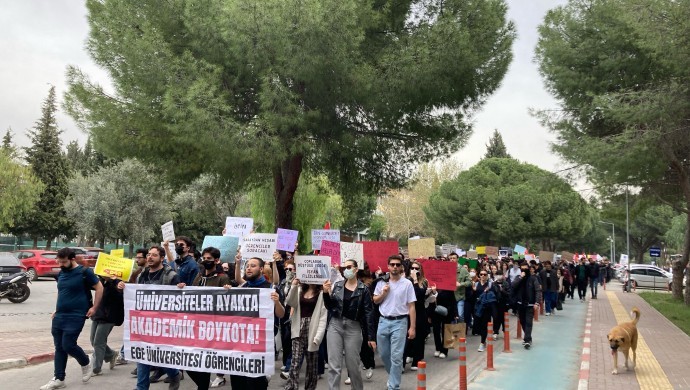 İzmir’de üniversite öğrencileri, İstanbul Büyükşehir Belediyesi’ne (İBB) yönelik soruşturmalara karşı başlattıkları eylemleri bugün de sürdürdü. Öğrenciler, dersleri boykot etti. Ege Üniversitesi’nde 1 No’lu yemekhane önünde bir araya gelen öğrenciler, “Üniversiteler ayakta, akademik boykotta” pankartı taşıdı. Ayrıca “Diplomasız Erdoğan” ve “Hırsız, katil AKP” sloganlarıyla şölen alanına doğru yürüyüş gerçekleştirdi. Burada forum ve müzik dinletisi düzenledi. Akademisyenler de öğrencilerin boykotuna destek verdi. Öğrenciler, akşam saatlerinde de Bornova’da yapılacak protestolara katılacak.