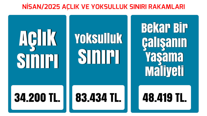 Nisan 2025 Açlık ve Yoksulluk Sınırı raporunu kamuoyuyla paylaşan BES-AR, 4 kişilik bir aile için açlık sınırının 34 bin 200 TL’ye, yoksulluk sınırının ise 83 bin 434 TL’ye ulaştığını belirtti.