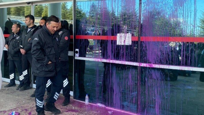 Hacettepe öğrencileri, üniversitede düzenlenen ve girişlerinin engellendiği “aile sempozyomu”nu mor boyalarla protesto etti.