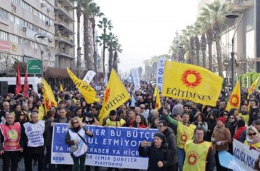 Fabrikalarından merkez binaya yürüyüş yapan işçiler, “Şarter inecek, bu iş bitecek”, “İş ekmek yoksa barış da yok” sloganlarıyla grev ilanını panoya astı.
