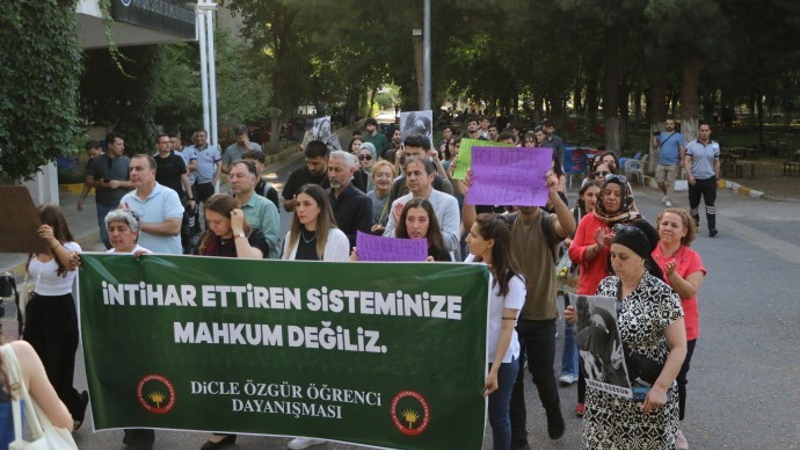 Diyarbakır’da intihara sürüklenen Sena Düzgün için yürüyen üniversite öğrencileri, “Bizler, bu yaşanılmaz düzeninizi reddediyoruz ve yarattığınız ölümlere karşı durmaksızın yaşamı haykırmaya devam edeceğiz. Kampüslerden sokaklara bulunduğumuz her yerde kırım politikalarını boşa çıkartacağız ve mücadelemizi büyüteceğiz” ifadelerini kullandı.