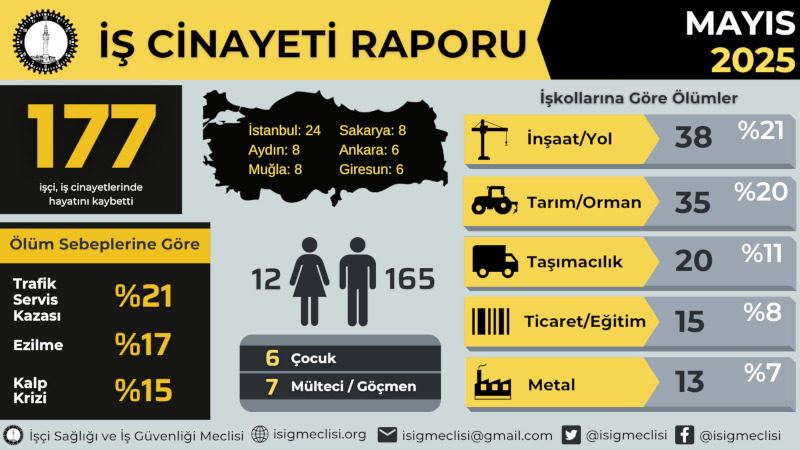 İşçi Sağlığı ve İş Güvenliği (İSİG) Meclisi, 2025 Mayıs ayı iş cinayetleri raporunu açıkladı. Rapora göre, Mayıs ayında en az 177 işçi iş cinayetlerinde katledildi. 2025 yılının ilk beş ayında iş cinayeti sayısı (Ocak 180, Şubat 124, Mart 159, Nisan 156 ve Mayıs 177) 796’ya ulaştı.