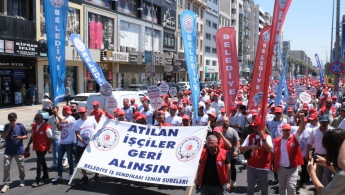 Türkiye Belediyeler ve Genel Hizmetler İşçileri Sendikası (Belediye-İş) İzmir Şubeleri, İzmir Büyükşehir Belediyesi’nde çalışan üyelerine yönelik alınan işten çıkarma kararına karşı sendika binasından belediyenin Egemenlik Evi binasına yürüdü. “Atılan işçiler geri alınsın” pankartının açıldığı yürüyüşte, “Kurtuluş yok tek başına ya hep beraber ya hiçbirimiz”, “İş, ekmek yoksa barışta yok” ve “Hak hukuk adalet” sloganları atıldı. Yüzlerce işçinin katıldığı yürüyüşe kentte bulunan siyasi parti ve kurumlar da destek verdi.