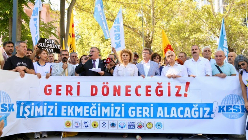 Kamu Emekçileri Sendikaları Konfederasyonu (KESK), kanun hükmünde kararnamelerle (KHK) görevden alınan kamu emekçilerinin işlerine geri dönmesi talebiyle Adalet Bakanlığı önünde eylem yaptı. Halkların Eşitlik ve Demokrasi Partisi (DEM Parti) Kocaeli Milletvekili Ömer Faruk Gergerlioğlu ve konfederasyona bağlı sendikaların üye ve yöneticilerinin de katıldığı eylemde, “Geri döneceğiz, işimizi ekmeğimizi geri alacağız” pankartı açıldı.
