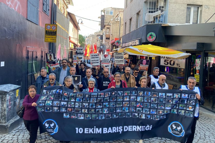 10 Ekim Barış ve Dayanışma Derneği İzmir Temsilcisi Mustafa Özdağ, katliamda yaşamını yitirenlerin isimlerini sayarak, 10 yıldır adalet mücadelesini devam ettiğini söyledi.