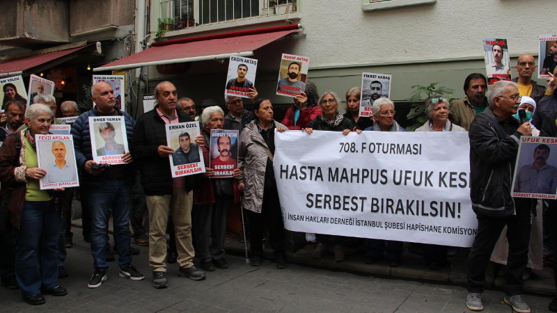 İnsan Hakları Derneği (İHD) İstanbul Şubesi Hapishaneler Komisyonu, hasta tutsakların durumuna dikkat çekmek amacıyla her hafta düzenledikleri “F Oturması” eyleminin 708’incisini Beyoğlu’nda bulunan dernek binası önünde gerçekleştirdi. Bu haftaki eylemde, Kandıra 2 No’lu F Tipi kapalı Hapishanesi’nde tutulan hasta tutsa Ufuk Keskin durumuna dikkat çekildi. Basın metnini İHD üyesi Ferit Barut okudu.
