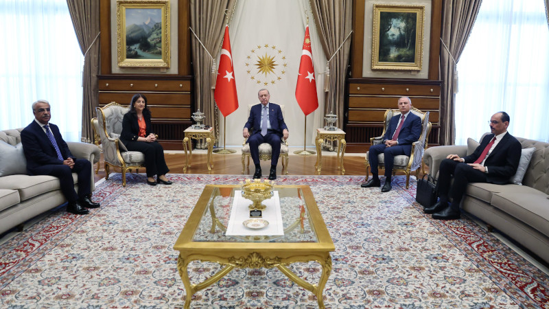 Halkların Eşitlik ve Demokrasi Partisi (DEM Parti) İmralı Heyeti üyeleri Pervin Buldan ve Mithat Sancar ile AKP Genel Başkanı ve Cumhurbaşkanı Tayyip Erdoğan arasındaki üçüncü görüşme dün gerçekleştirildi. AKP Genel Başkan Vekili Efkan Ala ve Milli İstihbarat Teşkilatı (MİT) Başkanı İbrahim Kalın’ın da katıldığı görüşme yaklaşık 1 saat sürdü.
