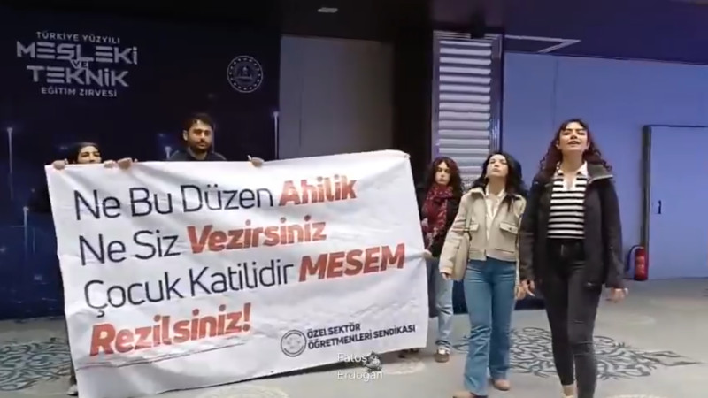 Özel Sektör Öğretmenleri Sendikası, İstanbul’da düzenlenen Mesleki ve Teknik Eğitim Zirvesi’ni bastı, sadece 2025 yılında 85 çocuk işçinin katledildiğine dikkat çekerek, “MESEM’ler kapatılsın, çocuk işçilik yasaklansın” dedi. Öğretmenler ters kelepçeyle gözaltına alındı.