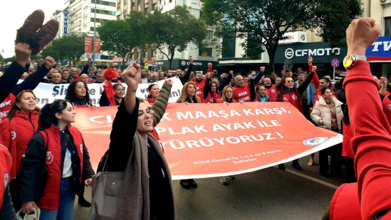 İzmir Büyükşehir Belediyesi (İzBB) işçileri, yan haklarında yapılan kesintiler ve aylardır ödenmeyen alacaklarının ödenmemesine karşı bugün yarım gün iş bıraktı. Sabah saatlerinde sendika binası önünde toplanan Devrimci İşçi Sendikaları Konfederasyonu’na (DİSK) bağlı Genel-İş üyesi işçiler, “Çıplak ücrete çıplak ayak” sloganıyla Kültürpark içinde bulunan belediye binası önüne çıplak ayak yürüyüşü gerçekleştirdi.