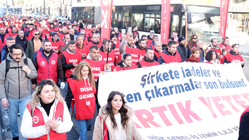 İzmir Büyükşehir Belediyesine (İzBB) bağlı İZENERJİ, İZELMAN, İZTEK, EgeŞehir ve İZFAŞ’ta dört aydır maaşların ödenmemesi ve havuz uygulamasına karşı işçilerin çıplak ayak eylemleri sürerken, işten atılan ve havuzda bekletilen işçiler, örgütlü olduğu Genel-İş İzmir 1,2,3 ve 9 No’lu şubelerin çağrısıyla Konak Pier önünde toplandı. Bir araya gelen işçiler,”İşimizi geri istiyoruz”, “Zafer direnen emekçinin olacak”, “İş, ekmek yoksa barış da yok”, “Havuza hayır” sloganları eşlinde Kültürpark 9 Eylül kapısı önünde bulunan direniş çadırına yürüdü.