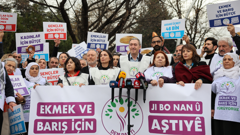 DEM Parti Eş Genel Başkanı Tuncer Bakırhan, “Emin olun ki Türkiye’nin dört bir yanından kardeşliğimizi ve dayanışmamızı büyüterek, bugün burada olduğu gibi taleplerimizi iletecek bir kitlesellikte bir araya gelebilirsek; bütçe asgari ücretlinin olur, emeklinin olur, kadının olur, öğrencinin olur, gencin olur, esnafın olur, çiftçinin olur, ezilenlerin olur. Bizler kendi sorunlarımızla kavrulurken mücadele etmezsek, dayanışmazsak Meclis’ten ne emeklilere ne emekçilere ne de asgari ücretlilere bütçe çıkar. Çünkü Meclis’in derdi emekçiler değil, kadınlar değil, KHK’liler değil, Barış Akademisyenleri değil. Bu Meclis’te iktidarın tek bir derdi var: Sermayeye, savaşa ve faiz lobilerine bütçe yapmak” ifadelerini kullandı.