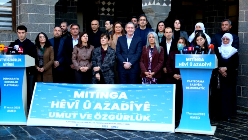 Diyarbakır’da 4 Ocak’ta İstasyon Meydanında düzenlenecek “Umut ve özgürlük” mitinginin deklarasyon açıklamasında Demokratik Kurumlar Platformu, Öcalan’a özgürlük talebini en güçlü irade ile sahiplenmek ve gerçekleştirmek için mitinge çağırdı.