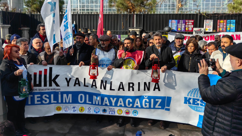 Kamu Emekçileri Sendikaları Konfederasyonu (KESK), Türkiye İstatistik Kurumu’nun açıkladığı Aralık 2025 enflasyon verilerinin, gerçeği yansıtmamasını protesto etmek için Ankara’da TÜİK binası önünde eylem yaptı. “Rakamlar yalan, yoksulluk gerçek” pankartının açıldığı eylemde “AKP’den hesabı emekçiler soracak” ve “Karanlığa teslim olmayacağız” sloganları atıldı.