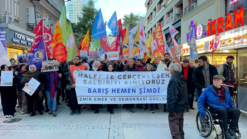 İzmir Emek ve Demokrasi Güçleri, cihatçı faşist HTŞ çetelerinin Demokratik Suriye Güçleri’nin (QSD) kontrolündeki Halep’teki Şêxmeqsûd, Eşrefiyê ile Benî Zêd mahallelerine yönelik saldırısına karşı yürüyüş yaptı. Alsancak Kıbrıs Şehitleri Caddesindeki ÖSYM önünde bir araya gelen çok sayıda kişi “Halep’teki gerçekleşen saldırıyı kınıyoruz, barış hemen şimdi” pankartıyla ve sloganlarla Türkan Saylan Kültür Merkezi önüne yürüdü.