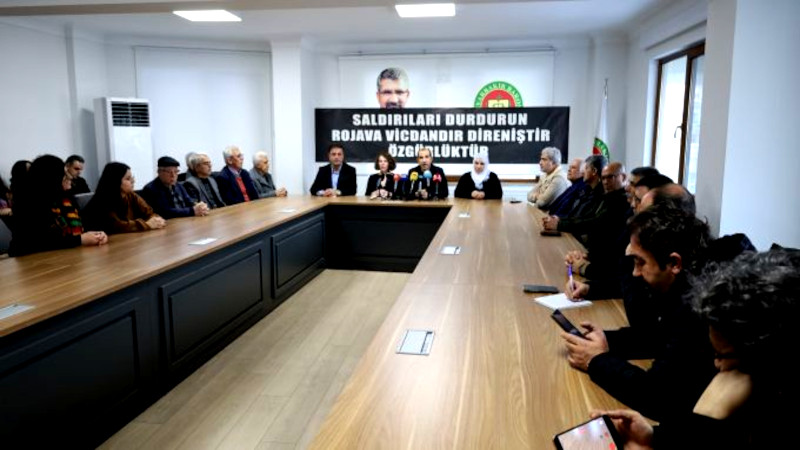 Demokratik Kurumlar Platformu, Demokratik Birlik İnisiyatifi ve Kurdî partiler, Rojava’ya yönelik saldırılara ilişkin Diyarbakır Barosunda açıklama yaptı. Açıklamaya Demokratik Bölgeler Partisi (DBP) Eş Genel Başkanları Çiğdem Kılıçgün Uçar, Keskin Bayındır’ın yanı sıra çok sayıda siyasi parti ile demokratik kitle örgütü temsilcisi katıldı. Salonda, “Saldırıları durdurun. Rojava vicdandır, direniştir, özgürlüktür” pankartı açıldı.