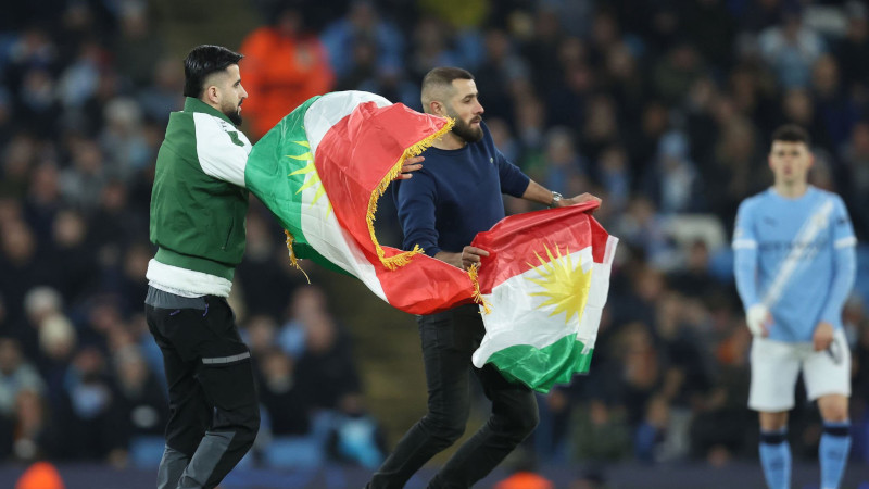 UEFA Şampiyonlar Ligi’nde Manchester City ile Galatasaray Londra’da karşı karşıya geldi. Maçın ikinci yarısının başında üç kişi, Rojava’ya dönük saldırıları protesto etmek için ellerinde Federe Kürdistan Bölgesi bayraklarıyla sahaya girdi.