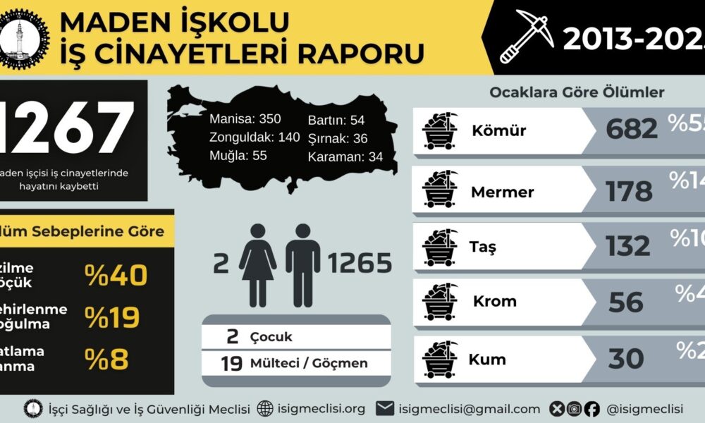 İşçi Sağlığı ve İş Güvenliği Meclisi, 3 Mart İş Cinayetleri ile Mücadele Günü’nde maden ocaklarında yaşanan iş cinayetlerine ilişkin açıklama yaptı. Meclis, tespit edebildiği kadarıyla 2013-2025 yılları arasında bin 267 maden işçisinin iş cinayetlerinde hayatını kaybettiğini açıkladı.