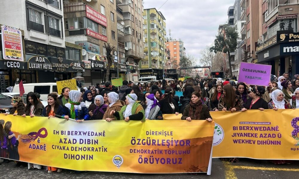 Kadınlar, Özgür Kadın Hareketi (Tevgera Jinên Azad-TJA) ve Dicle Amed Kadın Platformu’nun (DAKP), “Direnişle özgürleşiyor, demokratik toplumu örüyoruz” şiarıyla düzenleyeceği, 8 Mart Dünya Kadınlar Günü mitingi için merkez Yenişehir ilçesinide bir araya geldi. Ofis Semti’nde AZC Plaza önünde yöresel elbiseleriyle bir araya gelen kadınlar, “Niha dema jinê ye”, “Direnişle özgürleşiyor demokratik toplumu örüyoruz” pankartı ve “Jin, jiyan, azadî” sloganlarıyla mitingin düzenleneceği İstasyon Meydanı’na doğru yürüyüşe geçti.