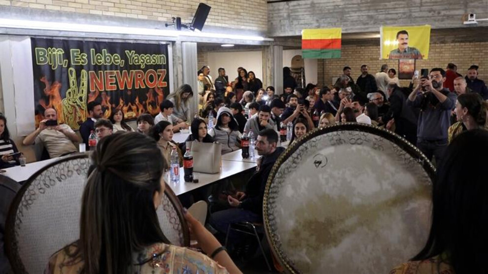 Resepsiyonun düzenlendiği mekanın bahçesinde toplanan şehit ve gerilla aileleri, “Bijî Serok Apo” sloganları atarak İsviçre’deki ilk Newroz ateşini yaktı.
