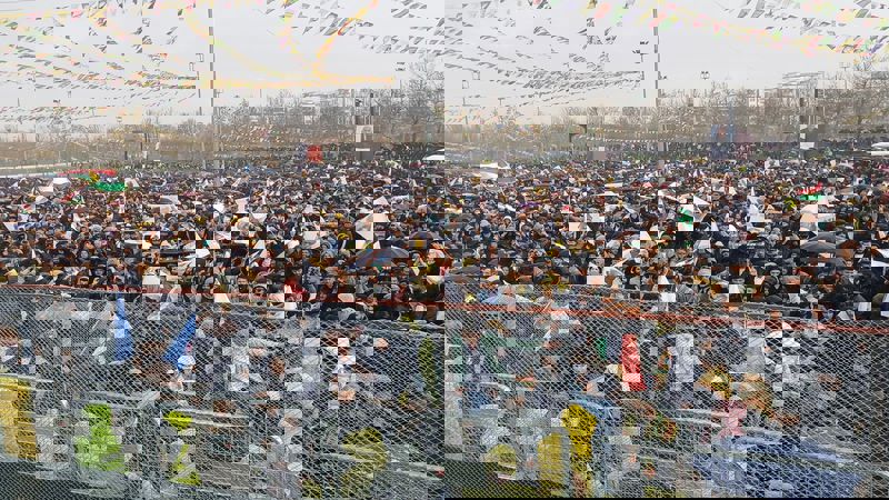 Alana girişler başlamadan önce toplanma noktalarında toplanan halk, sloganlarla girişlerin açılmasını bekledi. Özellikle kadınlar ulusal kıyafetleriyle dikkat çekerken, “Bijî Serok Apo” sloganları atılıyor.