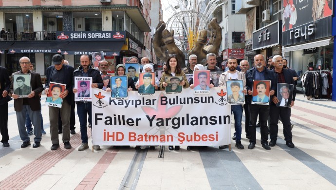 Batman’da İHD ve kayıp yakınları, eylemlerinin 731’inci haftasında Gülistan Caddesi’ndeki İnsan Hakları Anıtı önünde bir araya geldi. “Kayıplar bulunsun, failler yargılansın” pankartının açıldığı eyleme, insan hakları savunucularının yanı sıra sivil toplum örgütü temsilcileri de katıldı. Bu hafta, Êlih’te 2 Nisan 1994 tarihinde kimliği belirsiz kişiler tarafından kaçırıldıktan sonra kendisinden bir daha haber alınamayan Mahmut Demirel’in akıbeti soruldu.