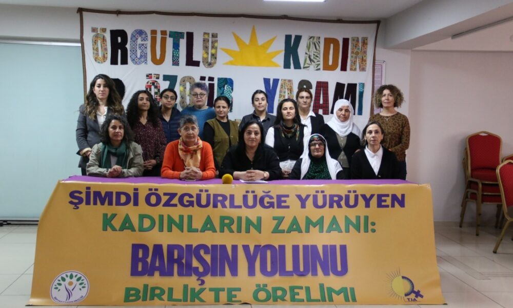 İzmir’de Özgür Kadın Hareketi (Tevgera Jinên Azad-TJA) ile Halkların Eşitlik ve Demokrasi Partisi (DEM Parti) Kadın Meclisi, 19 Nisan’da Gemlik’e yapılacak yürüyüşe ilişkin DEM Parti İzmir İl Örgütü’nde basın toplantısı yapıldı. Açıklamanın yapıldığı salona, “Şimdi özgürlüğe yürüyen kadınların zamanı: Barışın yolunu birlikte örelim” ile “Örgütlü kadın özgür yaşamı örüyor” pankartları asıldı. “Jin, jiyan, azadî” ve “Kadın, yaşam, özgürlük” sloganının atıldığı basın toplantısında açıklamayı TJA aktivisti Leyla Kaygısız okudu.