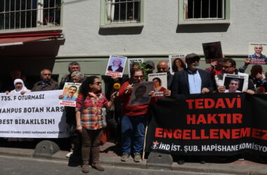 Açıklamayı okuyan İHD Şube Yöneticisi Ali Karadoğan, bir akraba düğününe yapılan baskınla gözaltına alınan Kadri Yılmaz için yapılan tüm başvuruların sonuçsuz kaldığını belirtti.