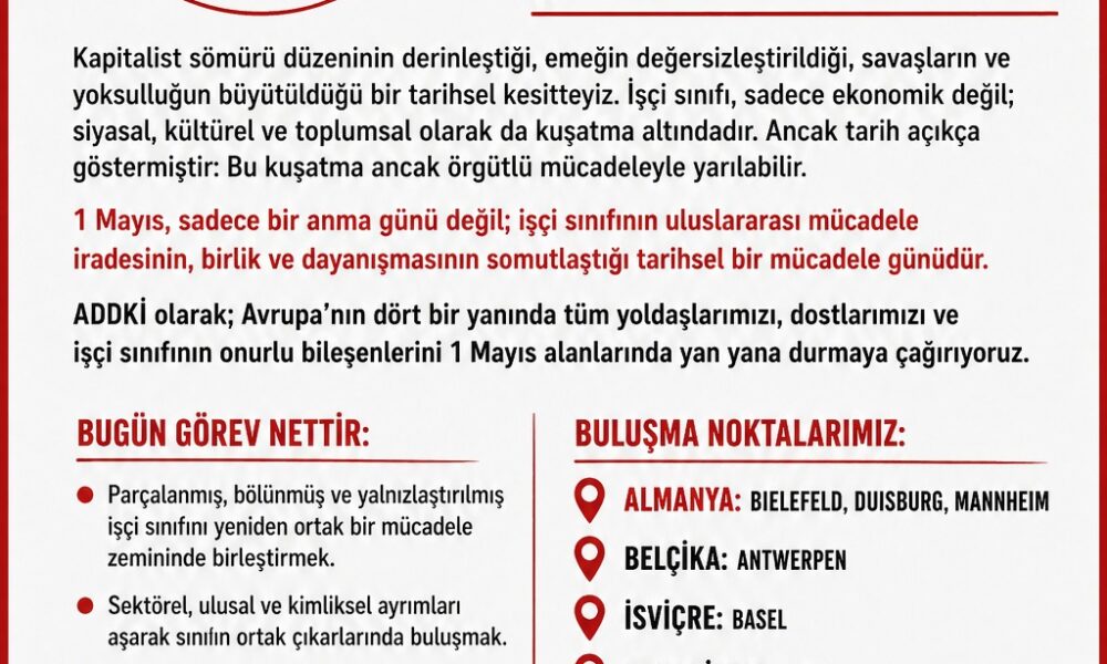 ADDKİ olarak; Avrupa’nın dört bir yanında tüm yoldaşlarımızı, dostlarımızı ve işçi sınıfının onurlu bileşenlerini 1 Mayıs alanlarında yan yana durmaya çağırıyoruz. Bugün görev nettir: Parçalanmış, bölünmüş ve yalnızlaştırılmış işçi sınıfını yeniden ortak bir mücadele zemininde birleştirmek. Sektörel, ulusal ve kimliksel ayrımları aşarak sınıfın ortak çıkarlarında buluşmak. Dayanışmayı sadece bir slogan değil, maddi bir güç haline getirmek.